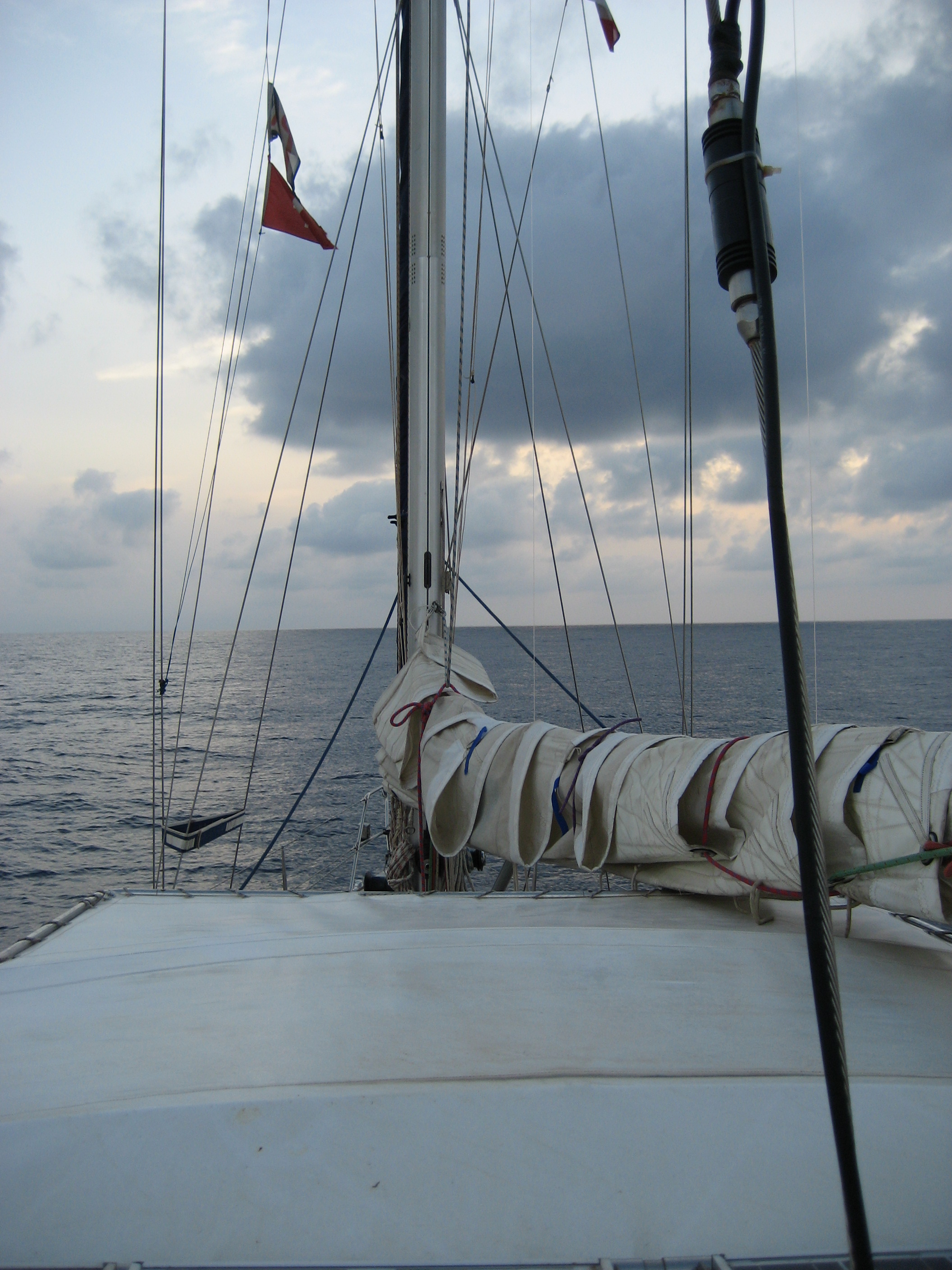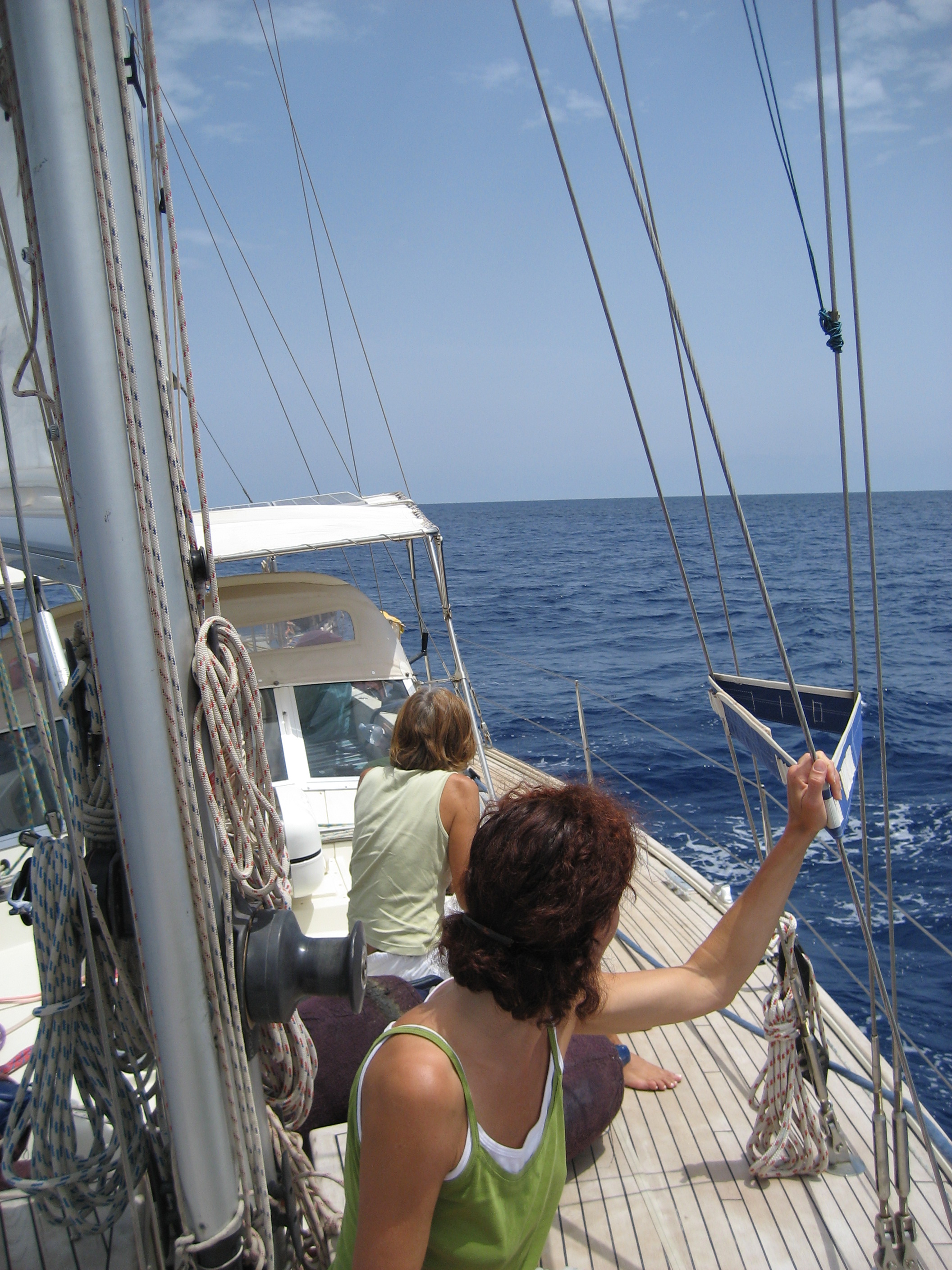 Spinnerwind, häufiger Segelwechsel, noch häufiger Motor – alles eher mühsam – kommt dazu, dass „alte See“ mit teilweise hohen Wellen die Szene beherrscht – so auch als ich deswegen 2 x den Filterkaffee verschütte! Sybille bedauernd: „ weißt Du was, mach doch halt nur Nescafé…“ – ausser Delfinen beim Boot und Frachter auf Kollisionskurs, gab es keine besonderen Ereignisse.