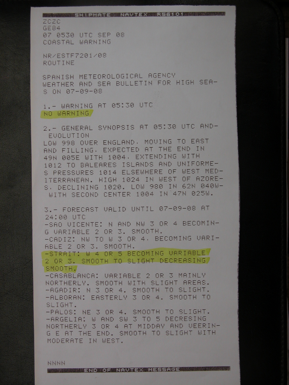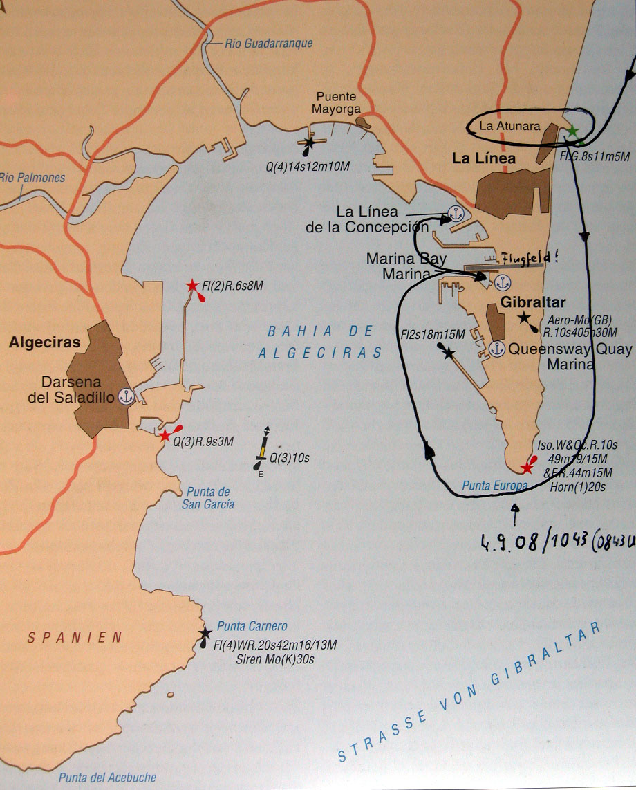 Am 04. Sept. 08 um 10.43 lok. Zeit haben wir „Punta Europa“ an Steuerbord quer ab, was unser Seefahrerherz schon etwas höher schlagen lässt. Auf eigenem Kiel an der Pforte zum Atlantik zu sein, ist ja nicht ganz alltäglich.