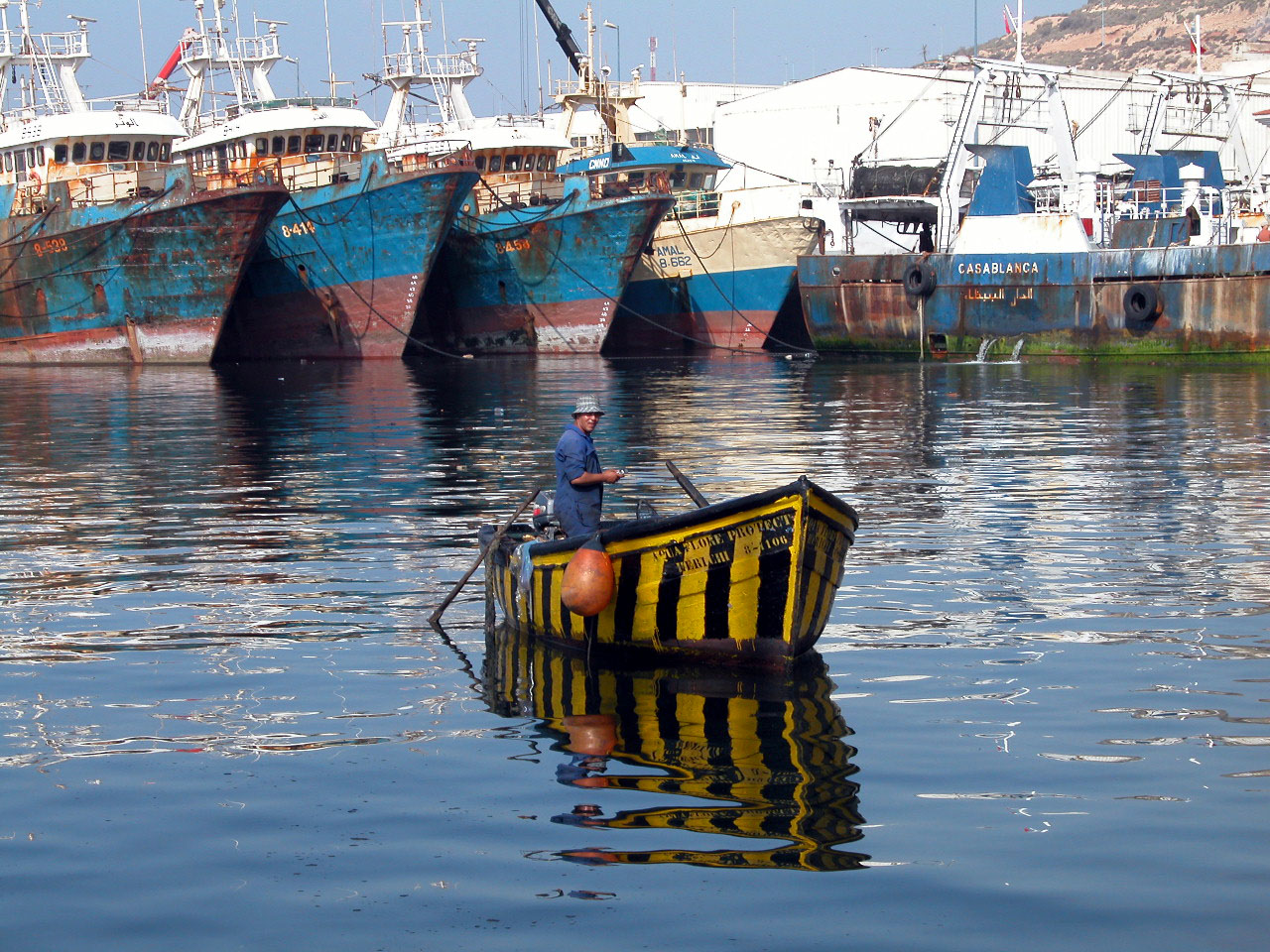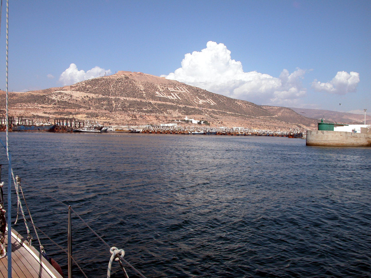 Schönes Segeln mit raumem Wind, leider ohne den zerrissenen Besan geht es der Küste entlang – keine besonderen Vorkommnisse in der Nacht und am folgenden Tag – mit langer Dünung geht es in den Abend hinein – herrlich: eine Herde Delphine begleitet uns während 20 Minuten bei Sonnenuntergang – dann nehmen Wind und Wellen zu – Reffen ist angesagt und eine Übung auf Vordeck weil die Furlingleine klemmt – nach rassiger Fahrt in die Nacht und abflauendem Wind in den Morgenstunden legen wir am Mittag längs an der SY Amaya (F) im äusserst verschmutzten Fischerhafen beim Yachtclub von Agadir an.