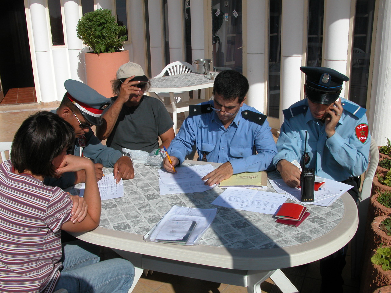 - der begleitende Polizist liefert mich bei der Passpolizei vis a vis ab und verschwindet dann, teilt mir aber noch schnell mit, dass ich halt aussen herum müsse wenn ich zurück zum Boot gehe. Den Passpolizisten hatte ich schon vorher beim Zoll gesehen, wo er einen lautstarken Redeschwall von sich gab und offenbar verärgert war. Freundlich aber bestimmt lässt er mich spüren, dass ich (Tourist) für ihn da bin und nicht er für mich – ein Franzose meinte später grinsend, dass die Marokkaner halt in früheren Zeiten von der französischen Administration gut ausgebildet worden seien.