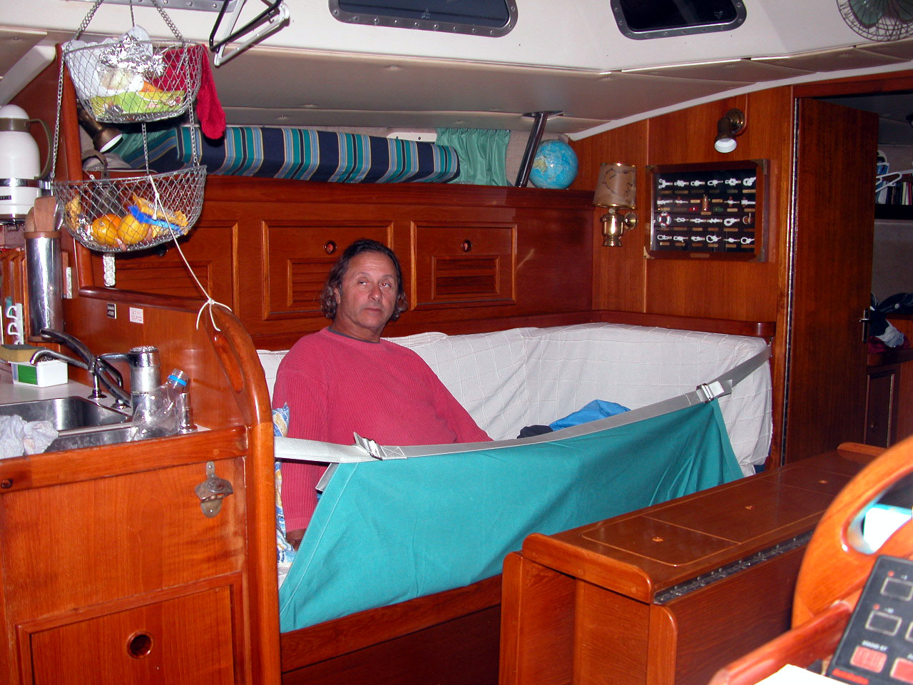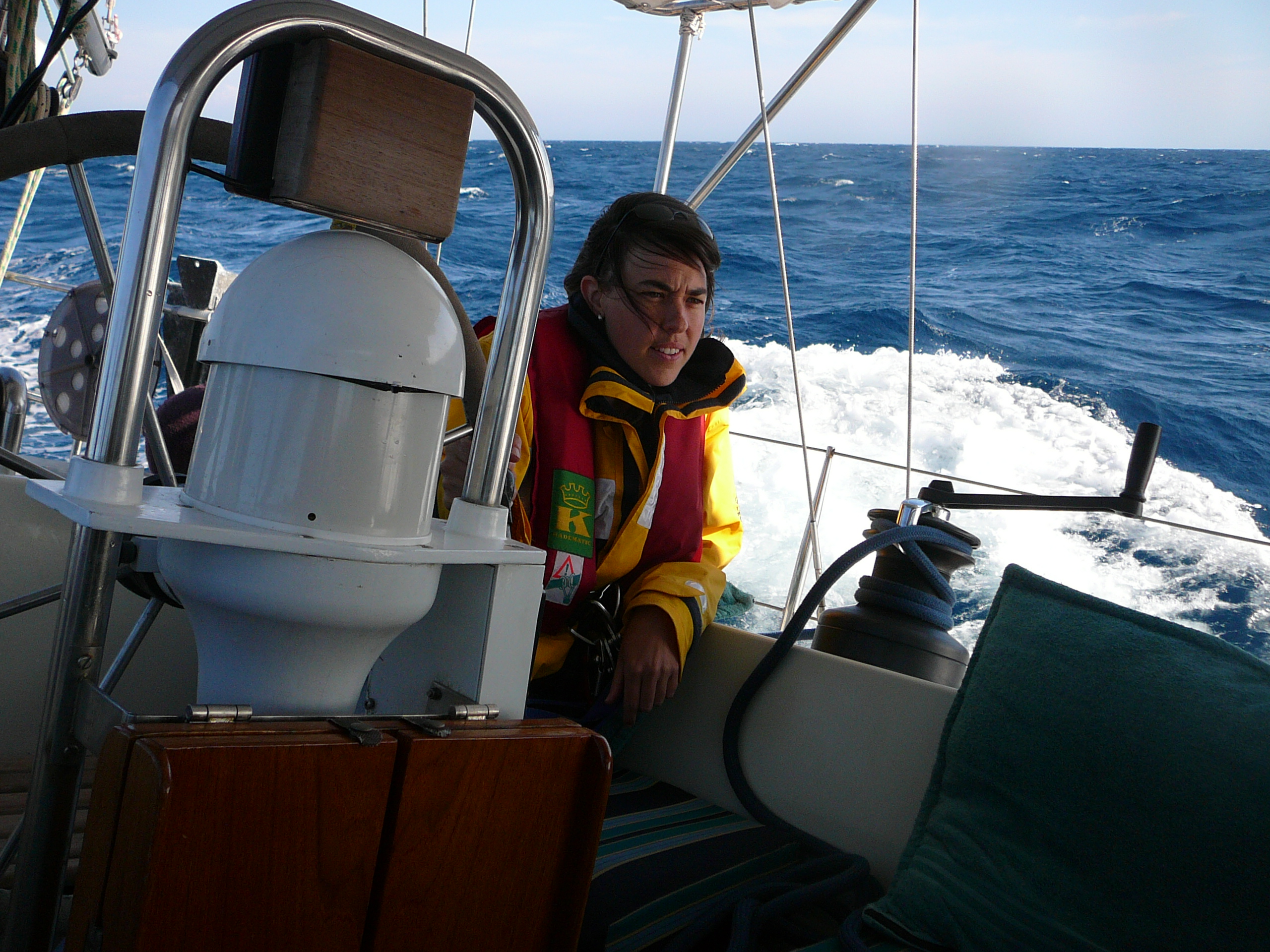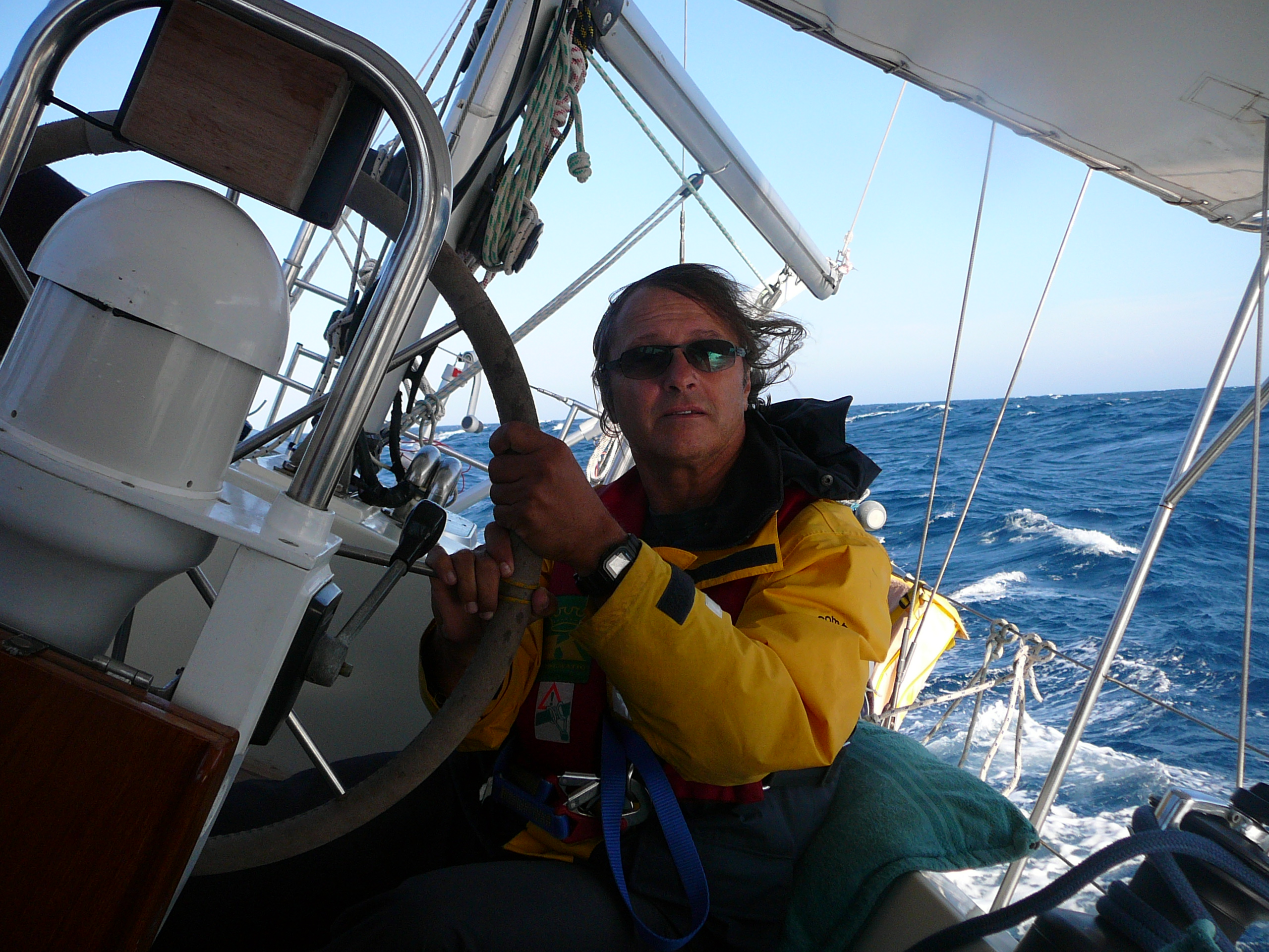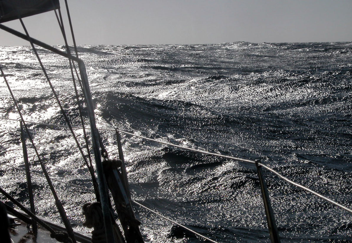 noch weiter gerefft werden – dadurch müssen wir vom Idealkurs abfallen – der Sturm ohne Ankündigung erreicht um 19.00 Uhr mit 40 Knoten seinen Höhepunkt, hält sich dann nachtsüber mit 30 Knoten in Grenzen – die hohen Wellen begleiten uns weiter.