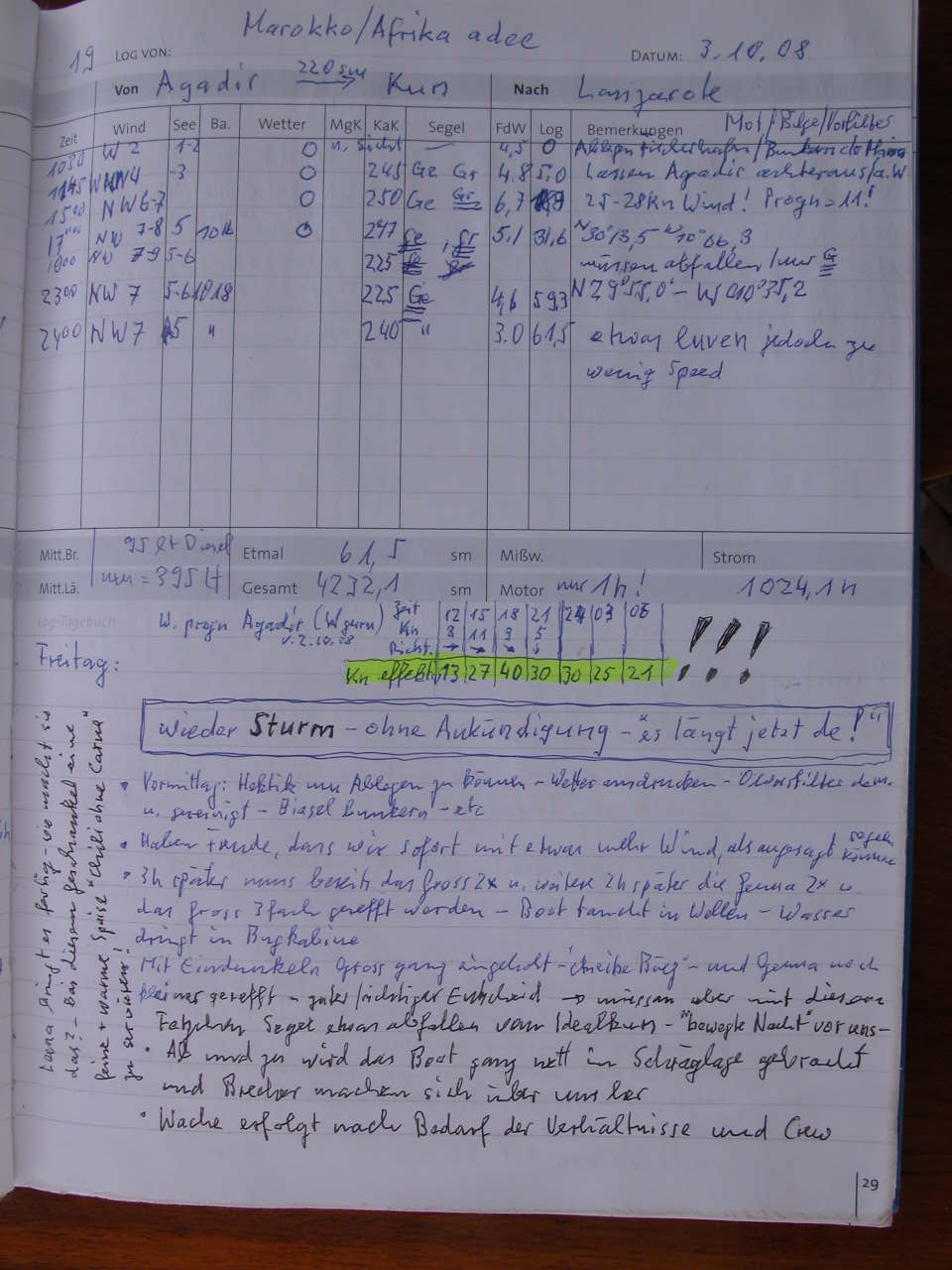 Am nächsten Morgen, es ist Freitag, legen wir mit allseits guten Wetterprognosen von Afrika bzw. Agadir in Marokko mit Kurs Richtung Kanarische Inseln ab. Vorher noch schnell Dieselvorfilter reinigen. Ich frage einen Mann mit einem Boot das „Aqua Flora Protect“ angeschrieben ist – er sammelt auf dem Wasser treibende Gegenstände ein – ob ich ihm ca 1 Liter verschmutzen Diesel abgeben könne. Er sagt ich solle es einfach ins Wasser ausleeren… !!! was natürlich so nicht geschieht.
