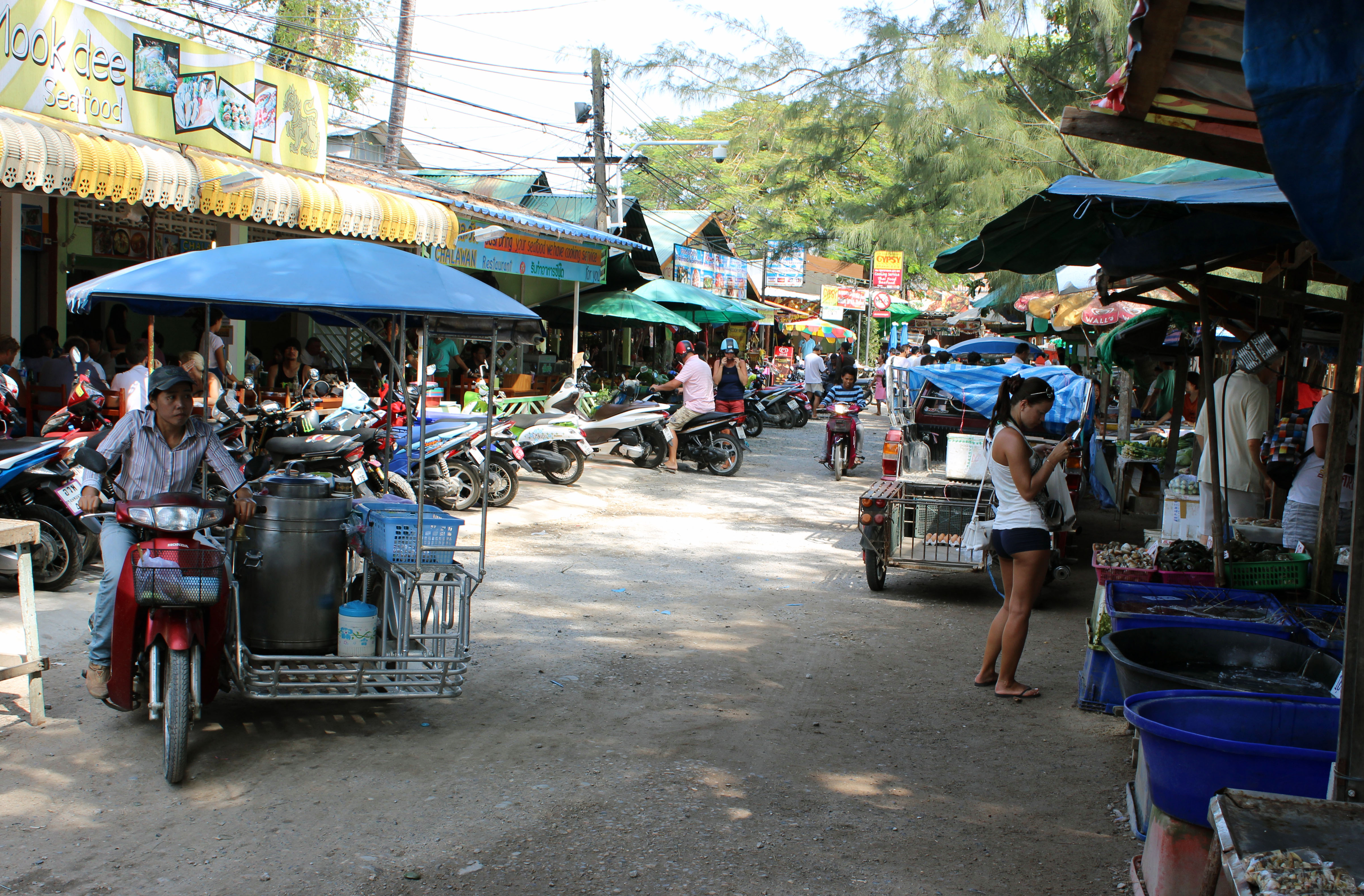 am Rawai-Beach gibt es viele Verkaufs-Stände – es ist durchaus üblich, dass man auf der einen Seite bei den See-Zigeunern Fisch kauft, wie wir es machten und vis-à-vis im Restaurant zubereiten lässt – übrigens wurden wir dort vom indisch stämmigen Chef beraten und von einem Lady-Man (Kellner) aufmerksam und freundlich bedient.