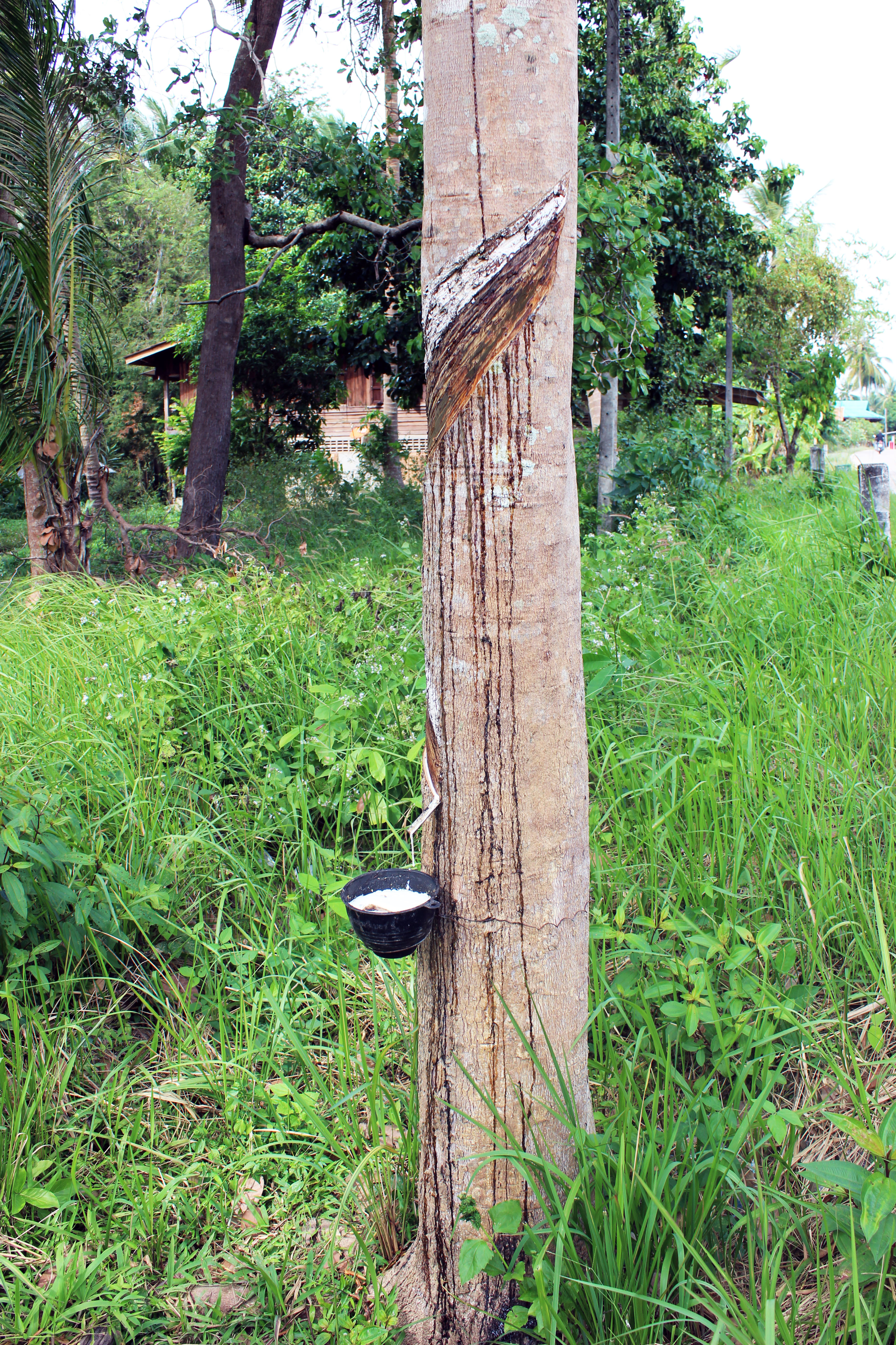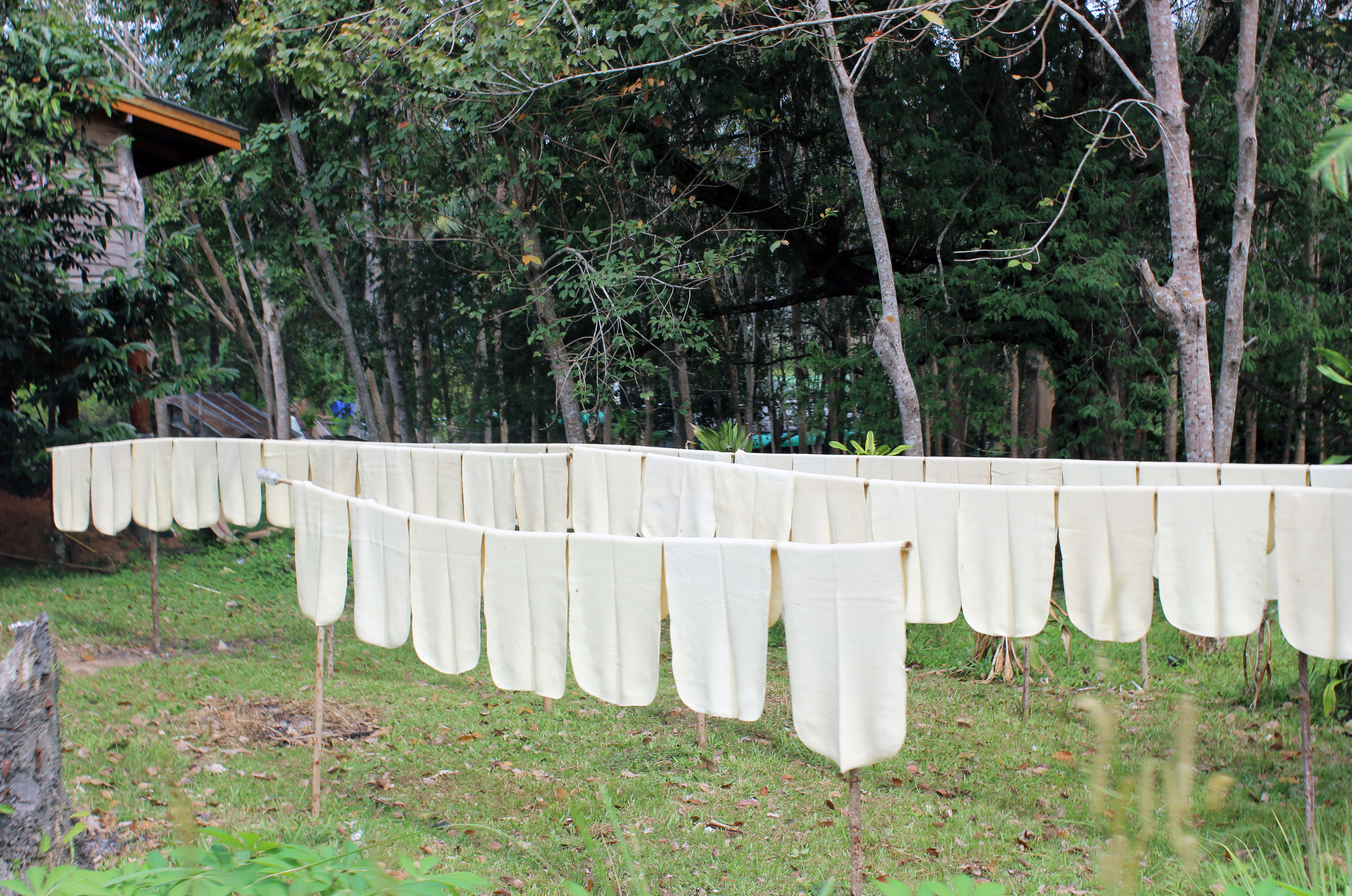 Die Plantagen wurden dem Dschungel abgerungen – die Bäume werden nach 7 Jahren Wachstum angeritzt und liefern 12 Jahre lang Saft – die Gewinnung erfolgt nachts – der Saft wird zu Matten verarbeitet und nach dem Trocknen exportiert – Hauptabnehmer ist China – dort erfolgt die Weiterverarbeitung zu Kondomen und für die Autoreifenherstellung wie der Guide erklärt.