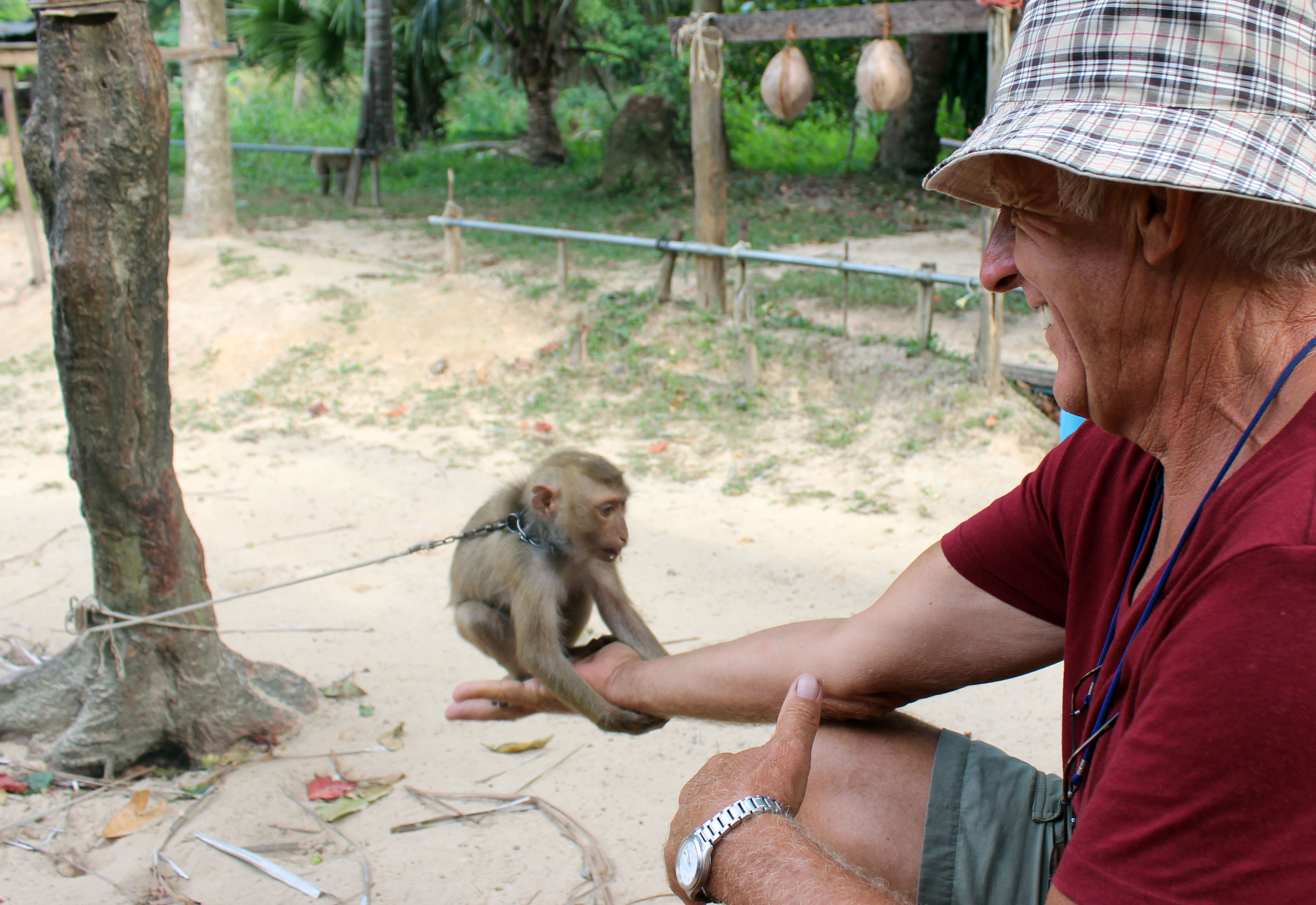 Einjähriger Affe einer Affen-Trainings-Station – die Affen werden von klein auf dahin gehend abgerichtet, um Kokosnüsse zu pflücken – sie drehen diese solange bis sie fallen – ein gut trainierter schafft 400 bis 500 Kokosnüsse pro Tag – uns tun diese Arbeitstiere leid.