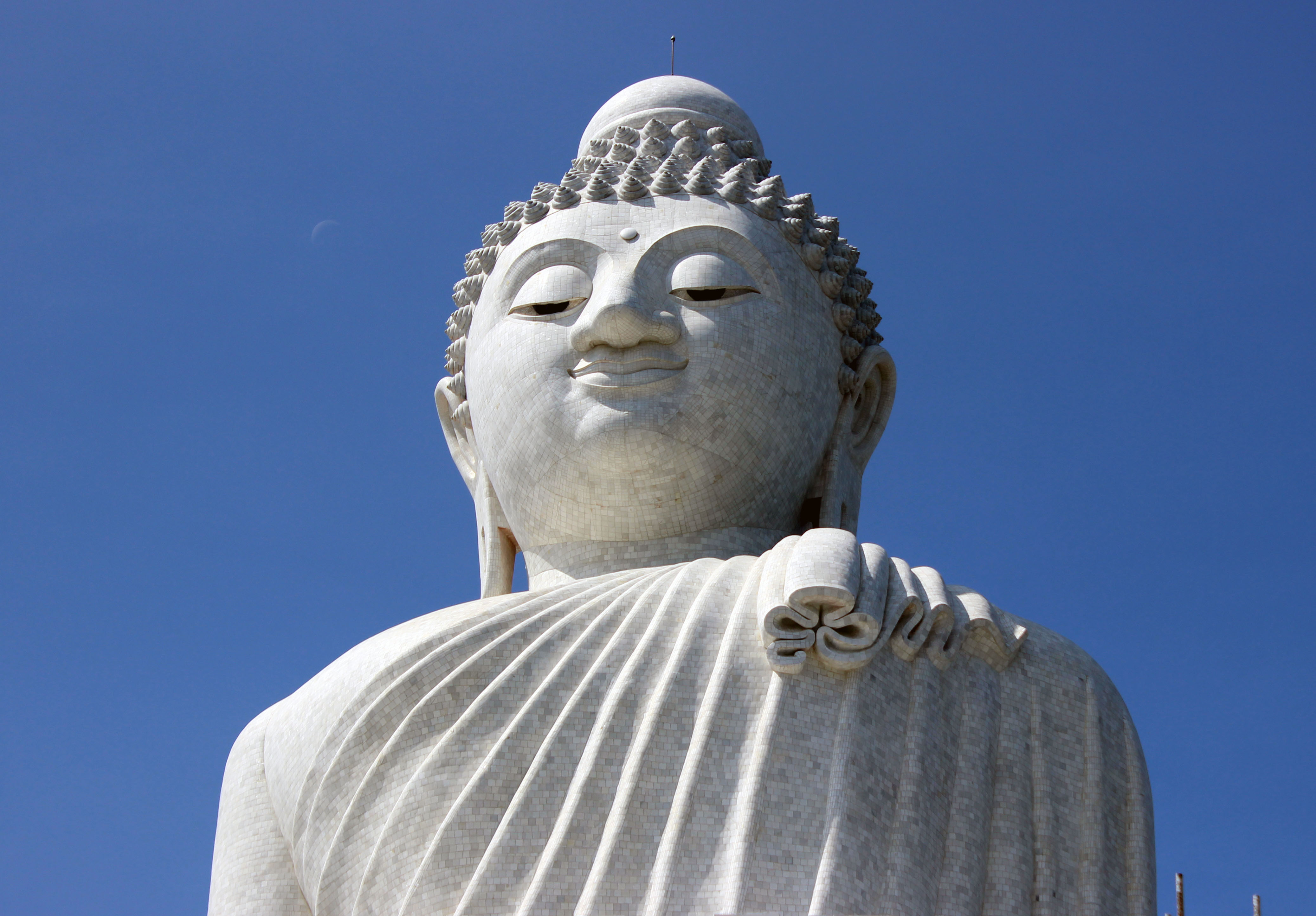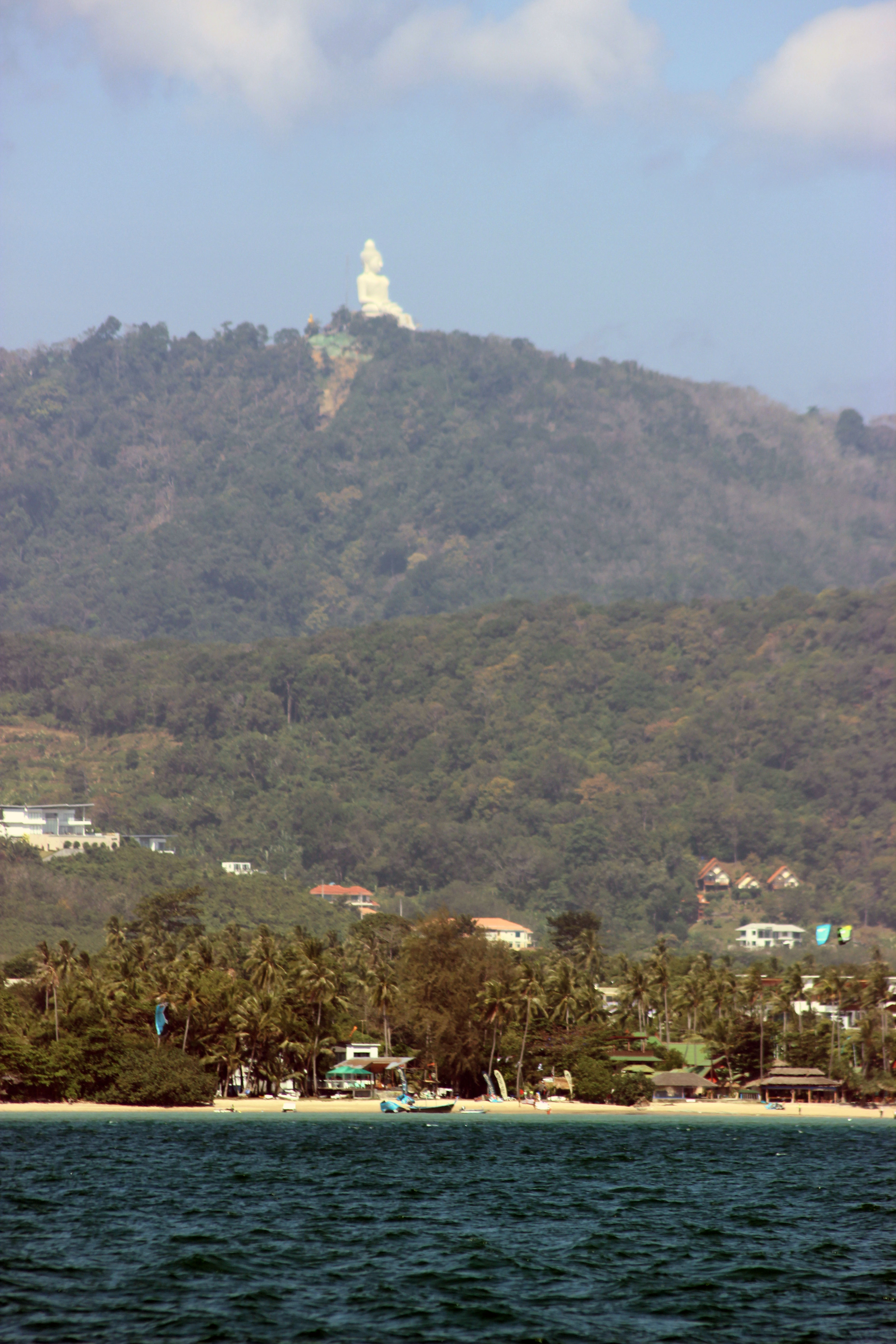 Eine riesige, weithin sichtbare Buddha-Statue aus lauter Mosaikplättchen thront über dem südlichen Teil der Insel (95 % der Thailänder sind Buddhisten, der Rest Moslems, Christen, Hindus).