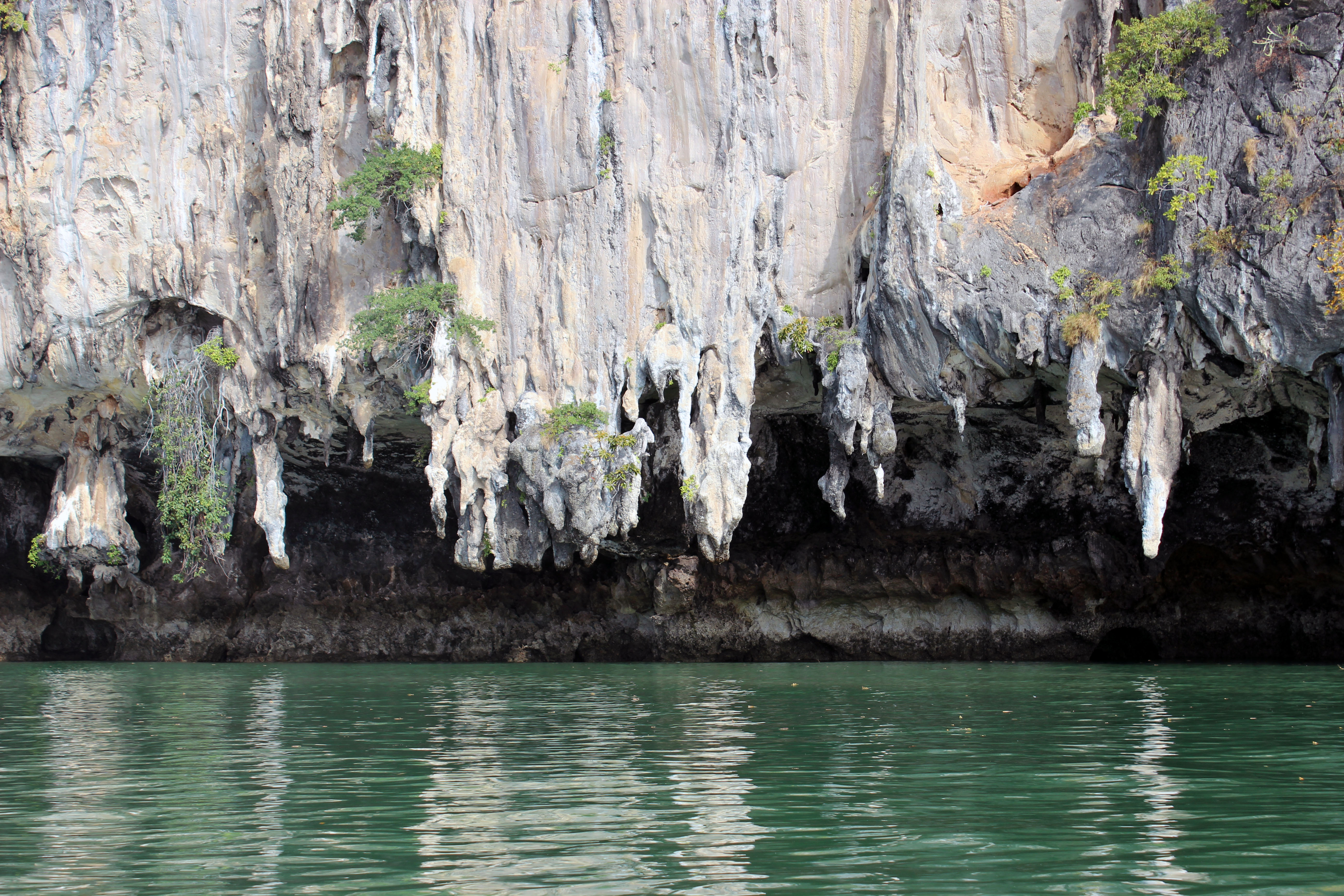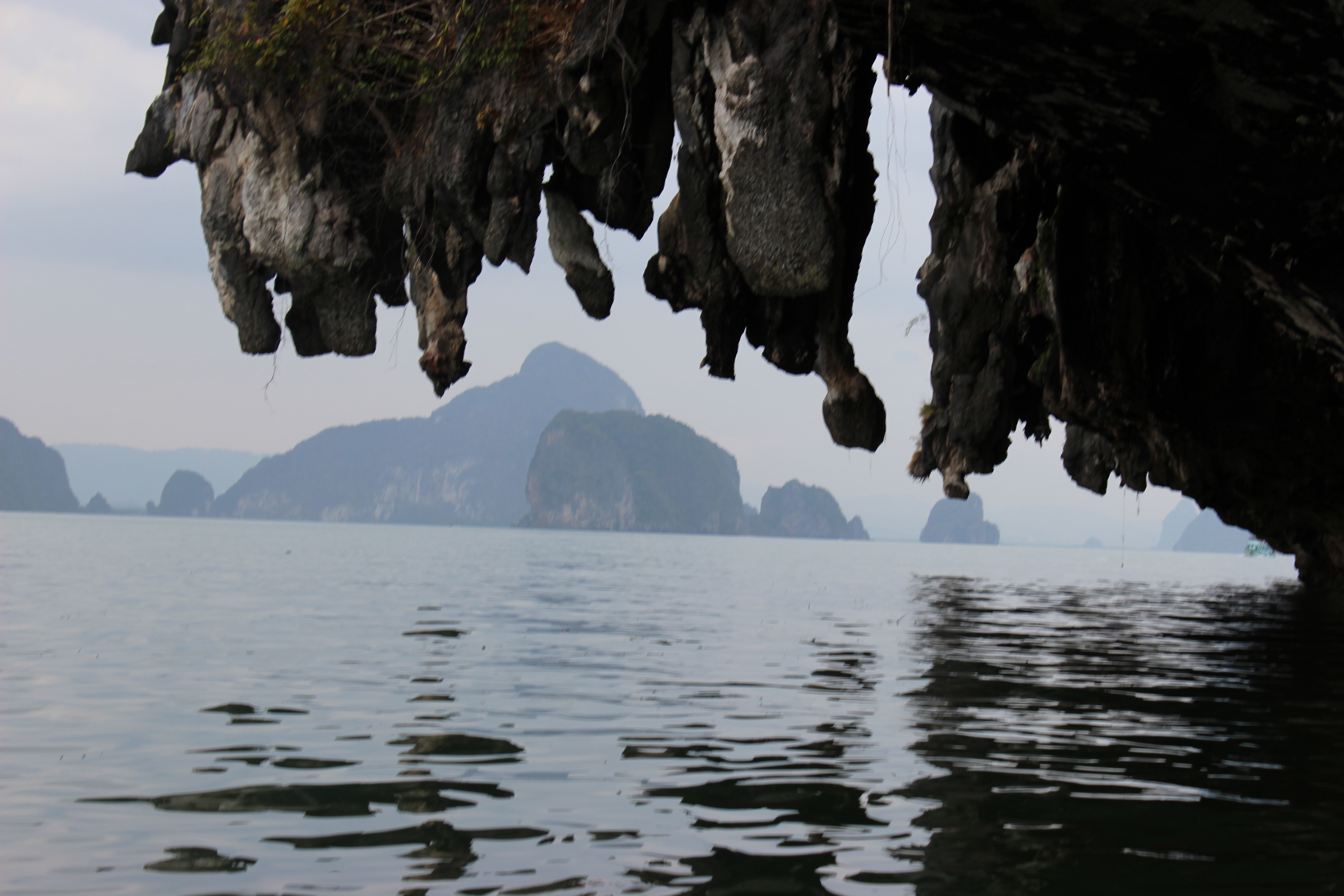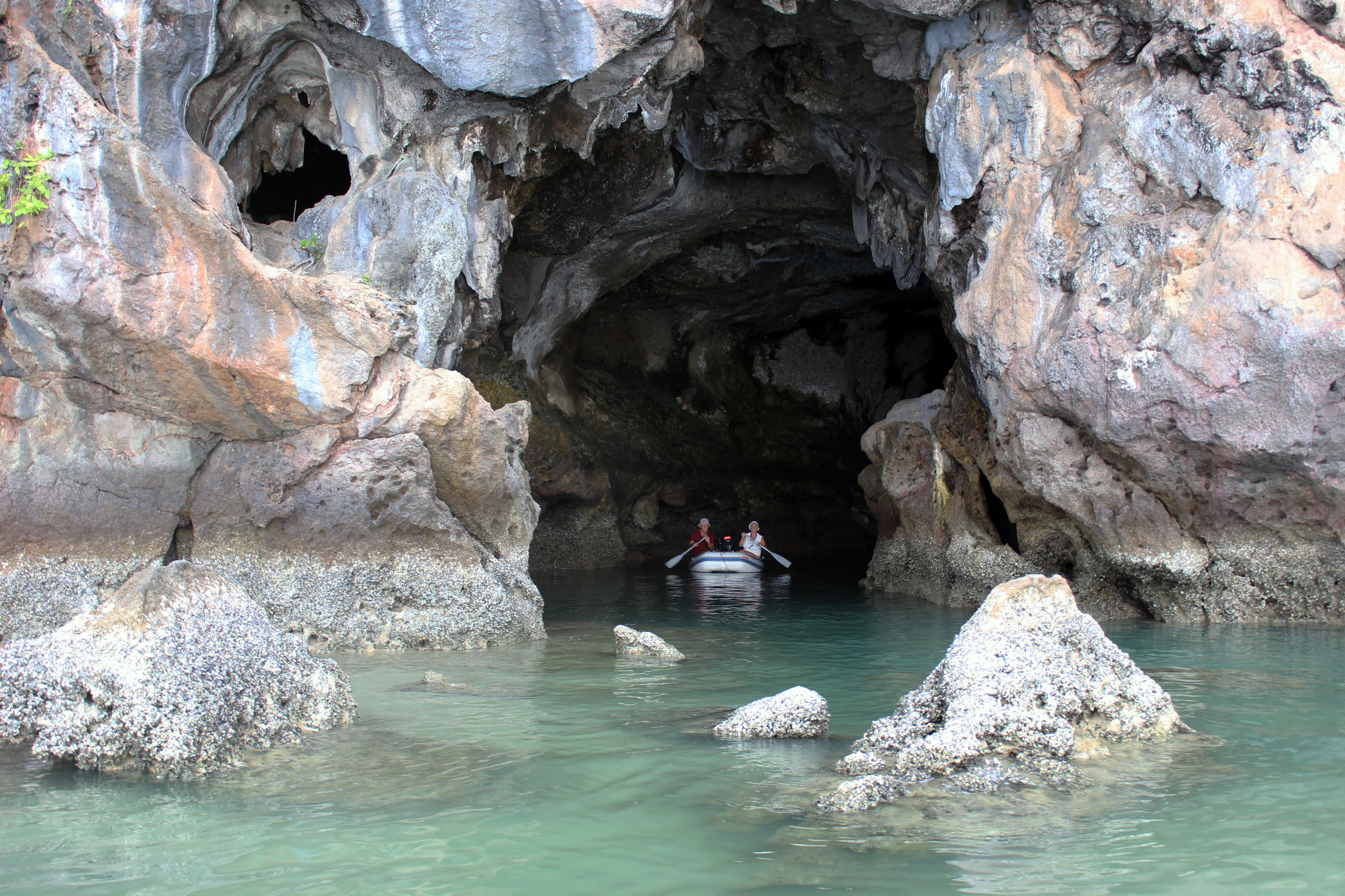 Mit Wind ist nicht viel los, aber die Landschaft ist eindrücklich – wir erforschen noch die Umgebung und fahren mit dem Dingi in eine Höhle ein, wo es Fledermäuse gibt und man, nach etwa 200 m im Dunkeln, auf der anderen Seite in einer kleinen Lagune wieder das Tageslicht erblickt – dann heisst es zurück, da die Tide anzusteigen beginnt.