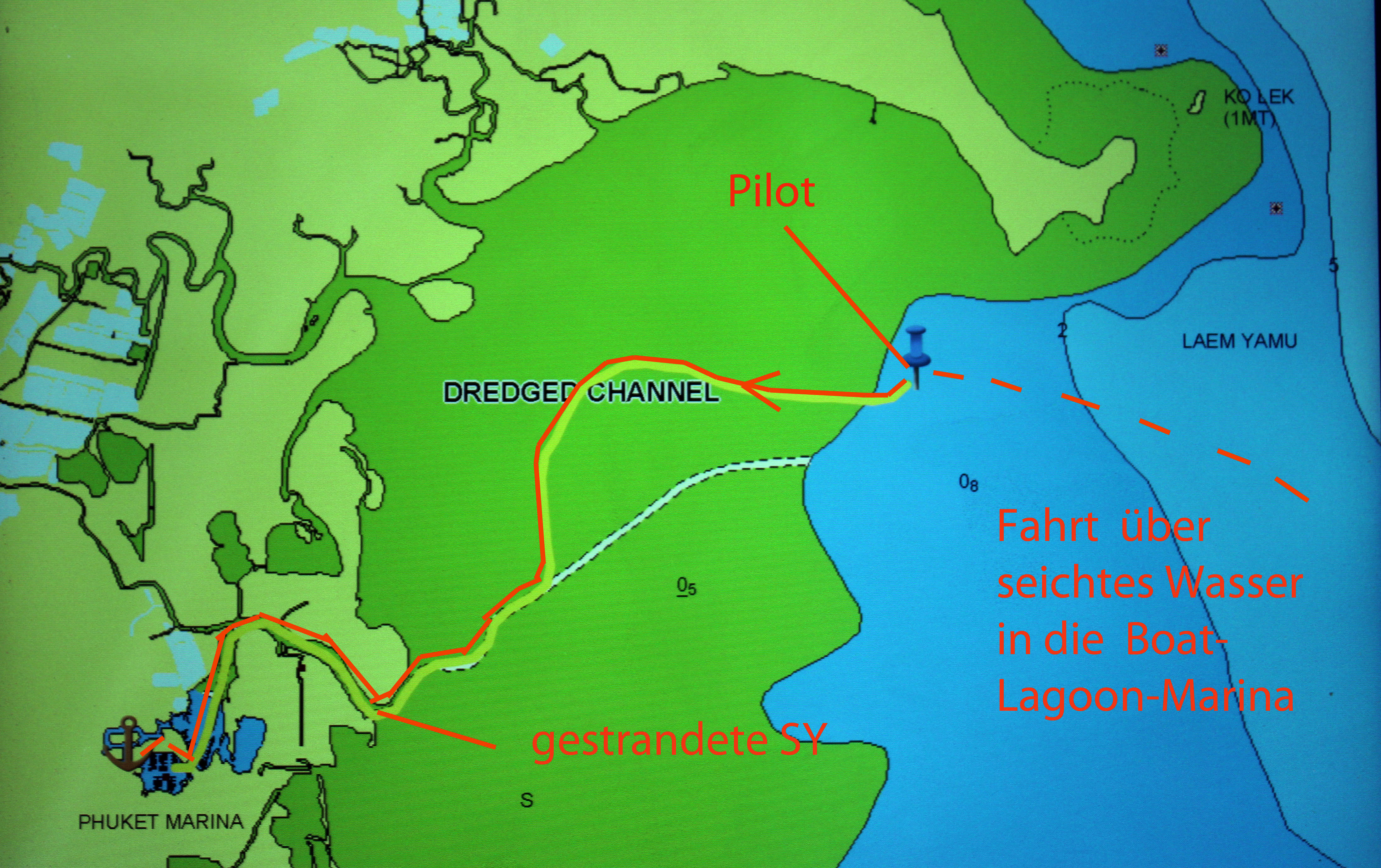 Nachdem auch noch die Wäsche zurück ist, Einkäufe getätigt und der Wassermann 200 Liter Trinkwasser gebracht hat (den Wassermacher nahmen wir erst später ausserhalb der schmutzigen Lagune in Betrieb), verlassen wir zufrieden die Marina – wiederum mit einem Piloten – diesmal bei etwas höherem Hochwasserstand und ohne Bodenberührung. Die Unglücksyacht ist nicht mehr da – sie ist nach umfangreichen Baggerarbeiten frei gekommen, dürfte aber im Innern grosse Wasserschäden zu beklagen haben.