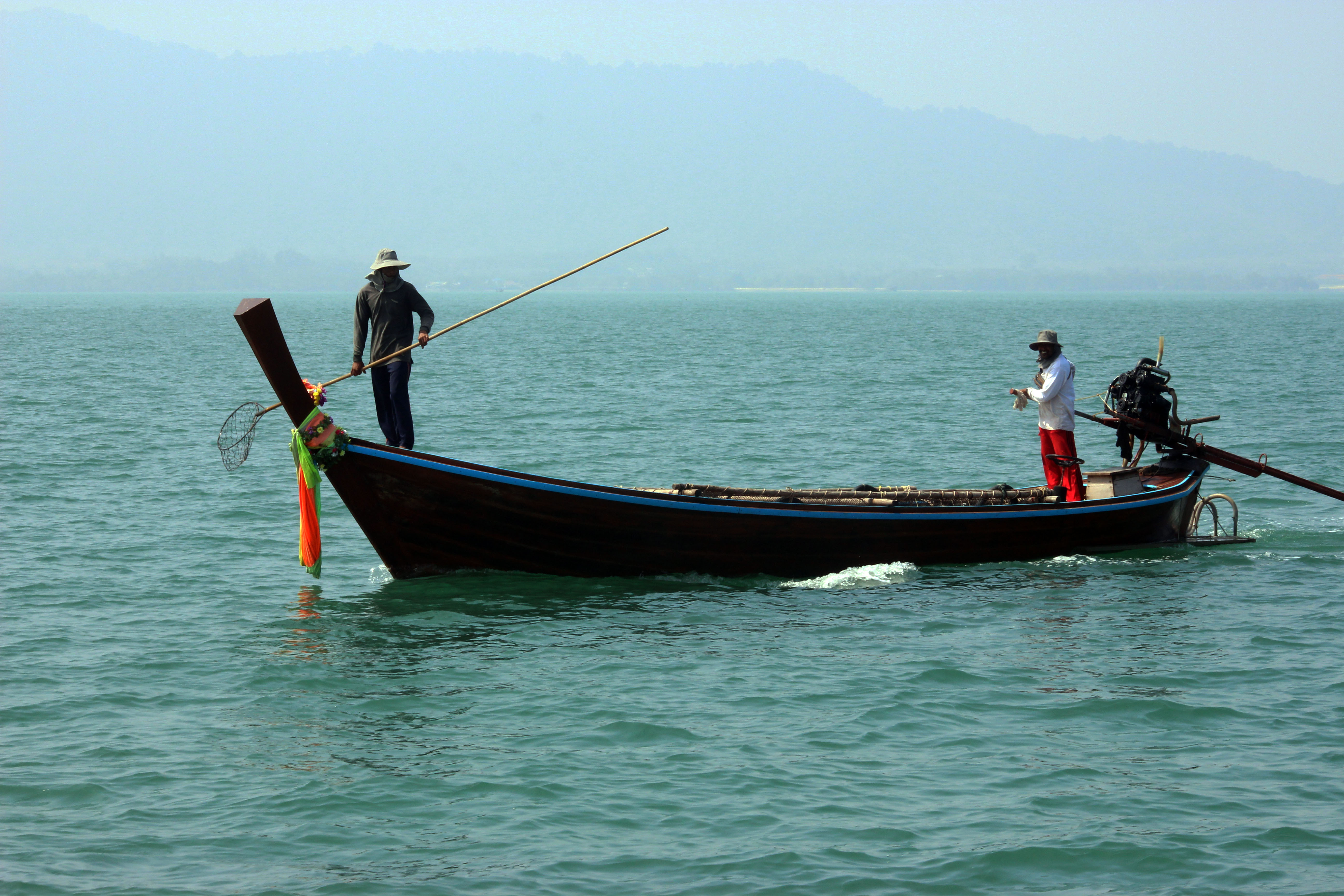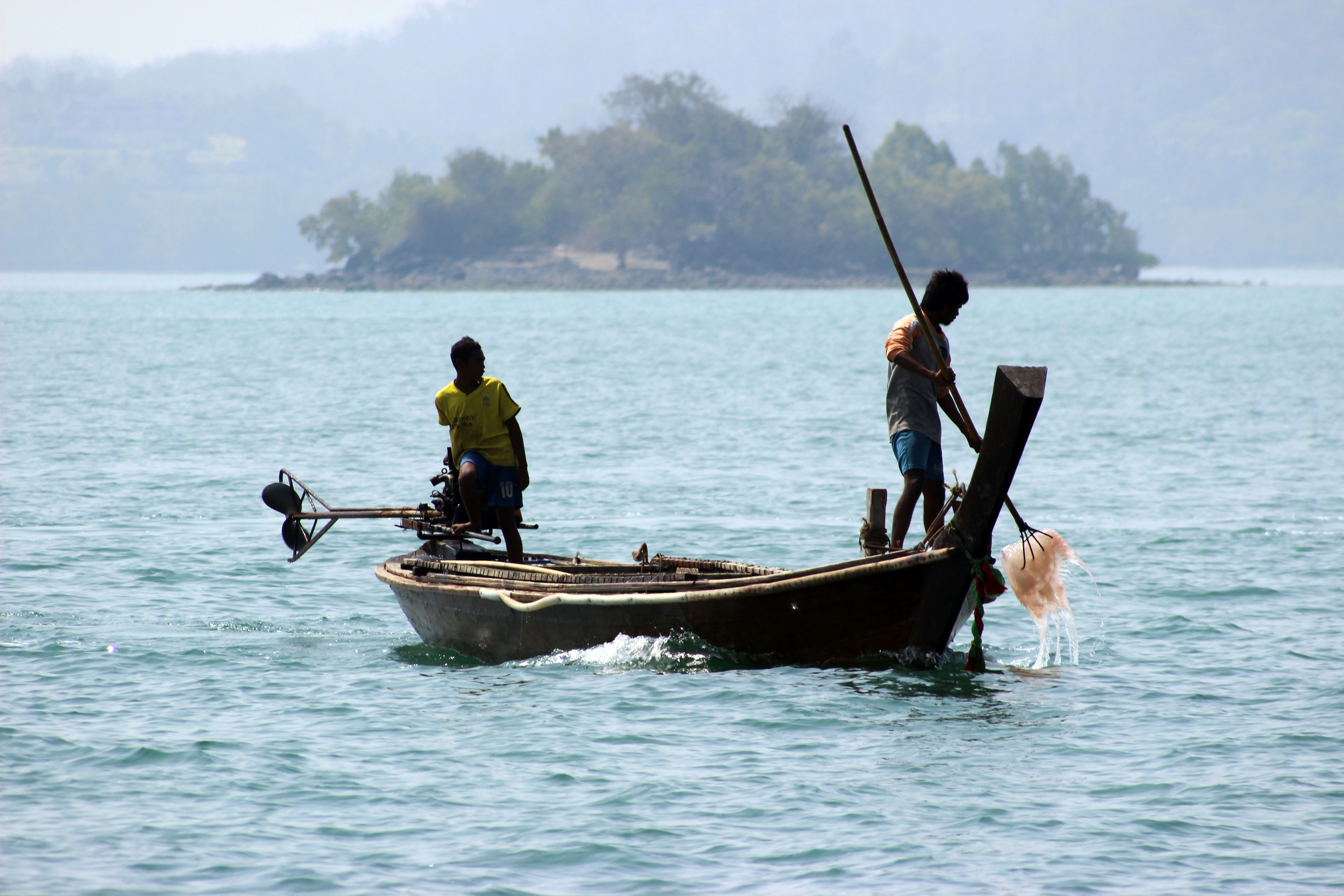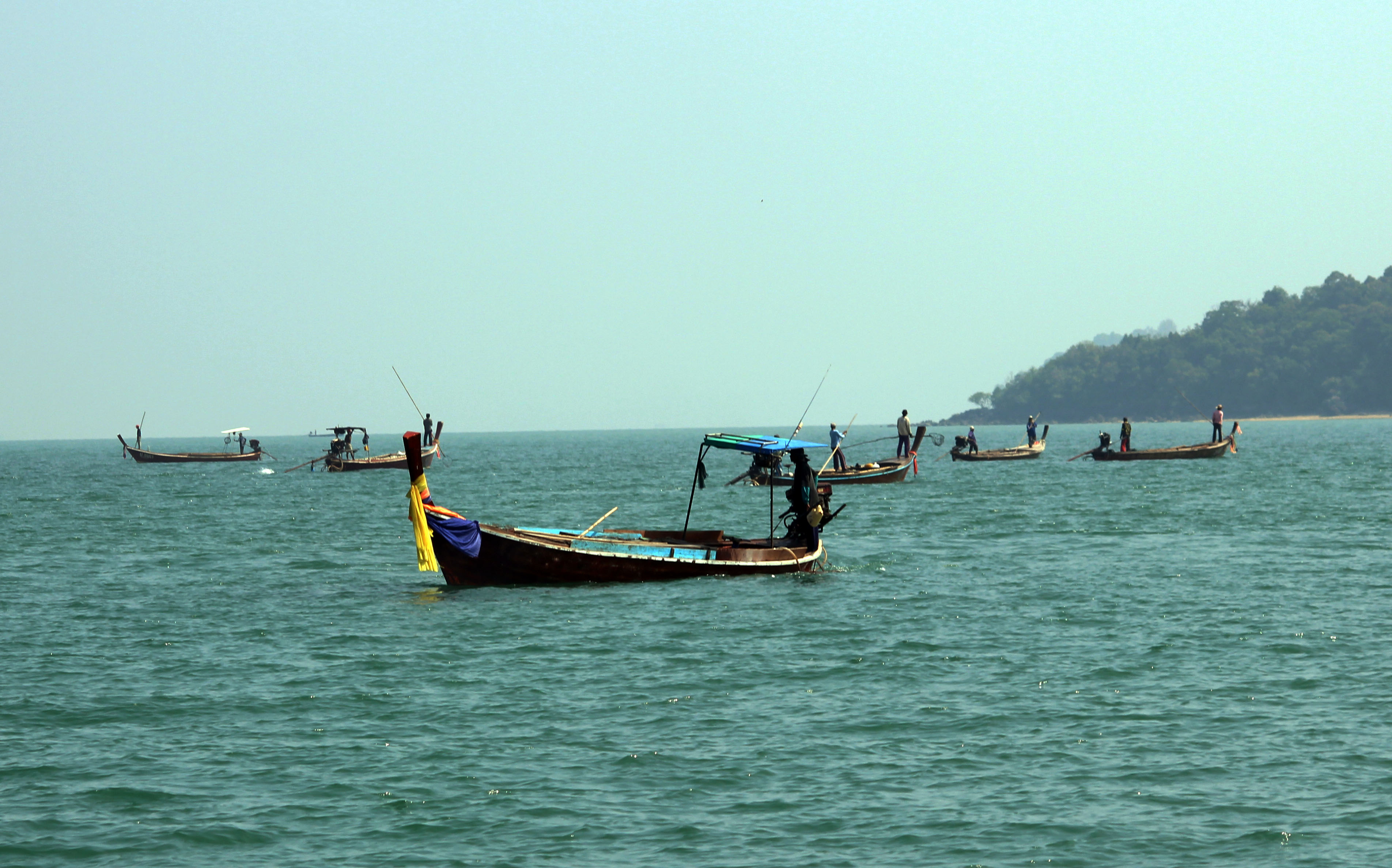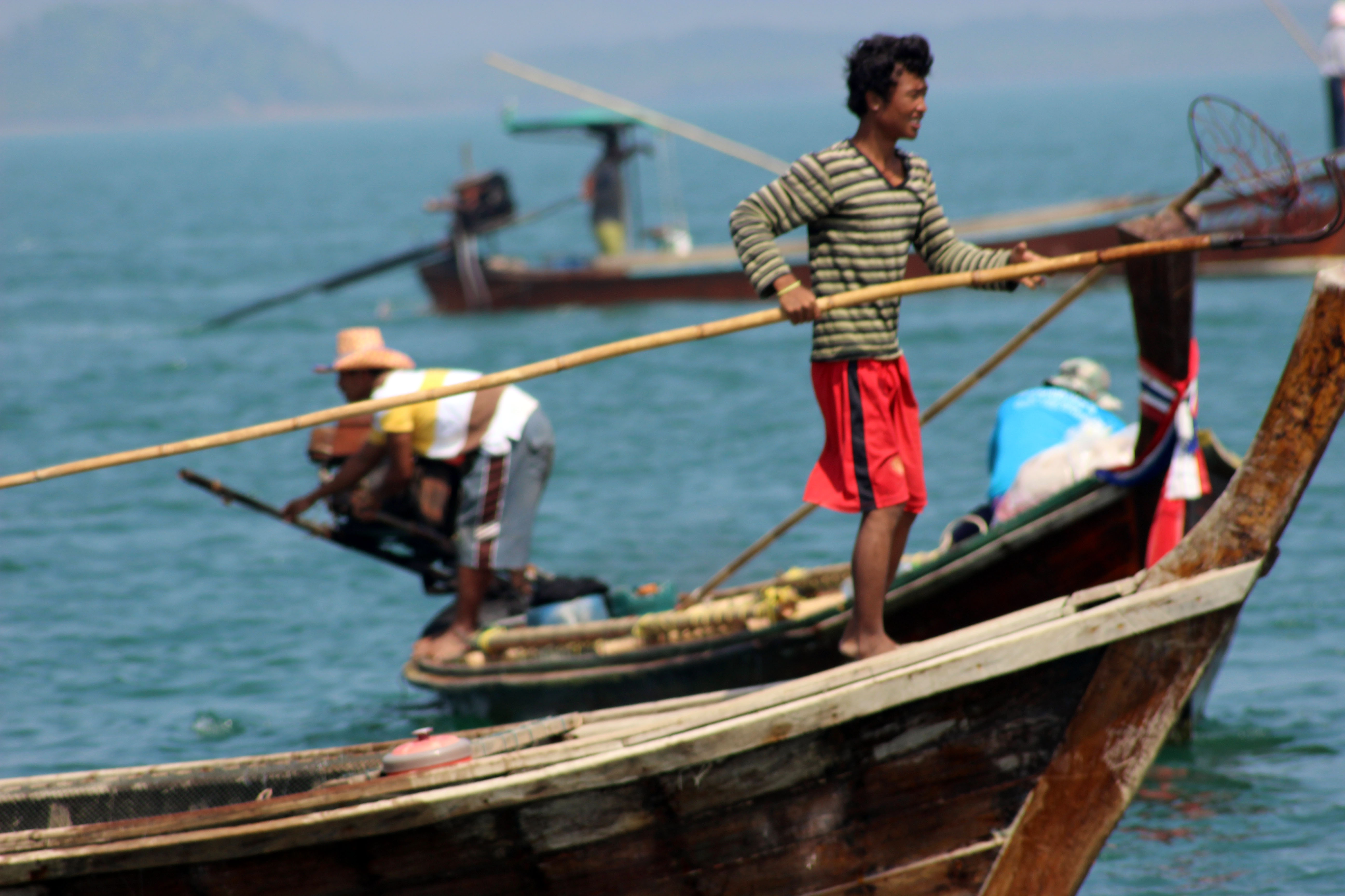 Wir segeln nochmals in den Norden von Phuket – im 10 sm langen Nord-Channel, der die Insel Phuket vom Festland trennt, passieren wir viele Fischerboote – uns bietet sich ein interessantes Schauspiel – 60 Boote befreien mit einer Aktion das Seegebiet während einer ganzen Woche von grossen rosaroten Quallen, die mit Netzen oder Gabeln an langen Stangen herausgefischt werden.