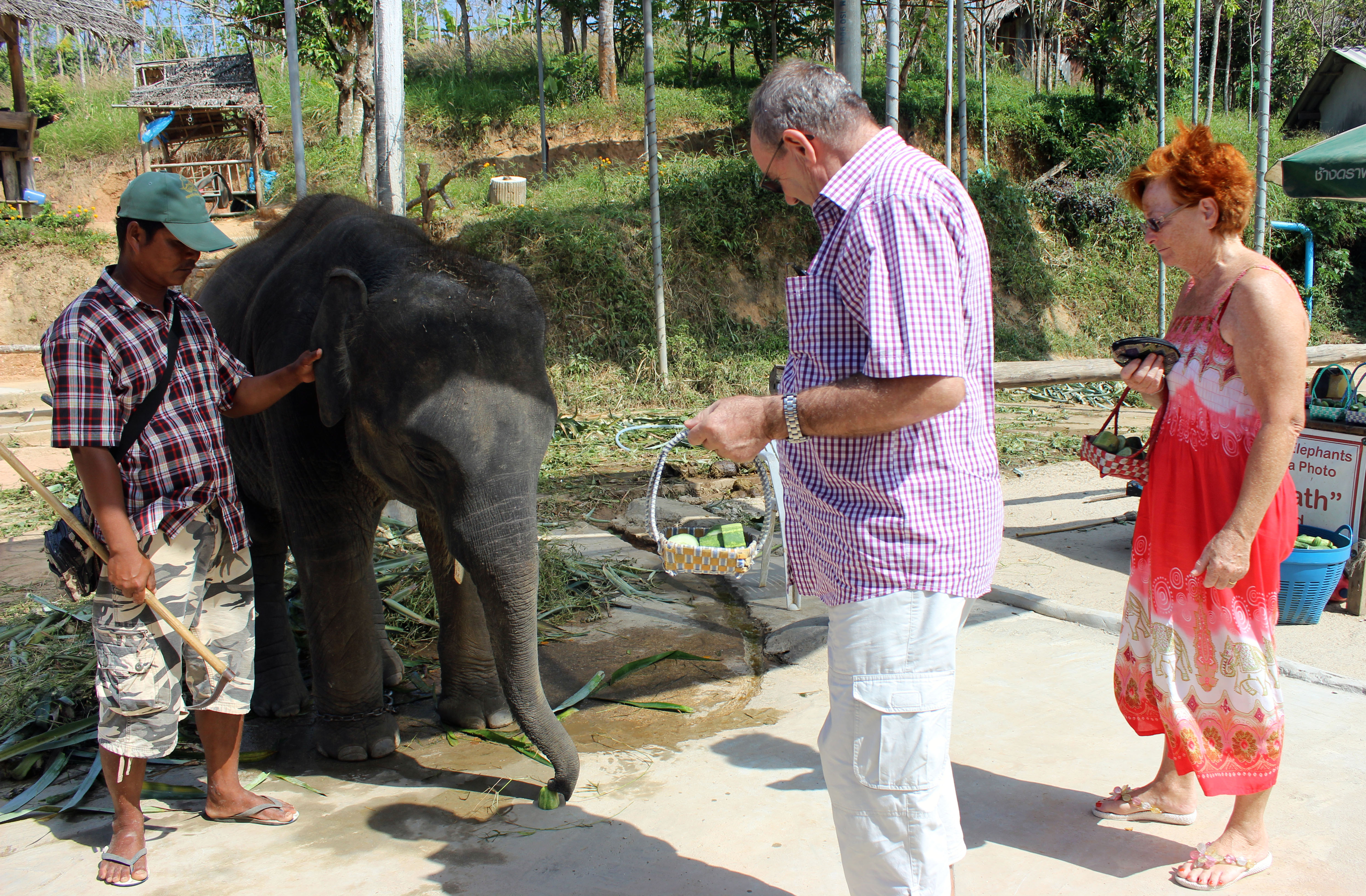 bei einer Elefanten-Station: Peter und Margrith beim Füttern eines 2-Jährigen Elefanten – daneben Holzschnitzerei