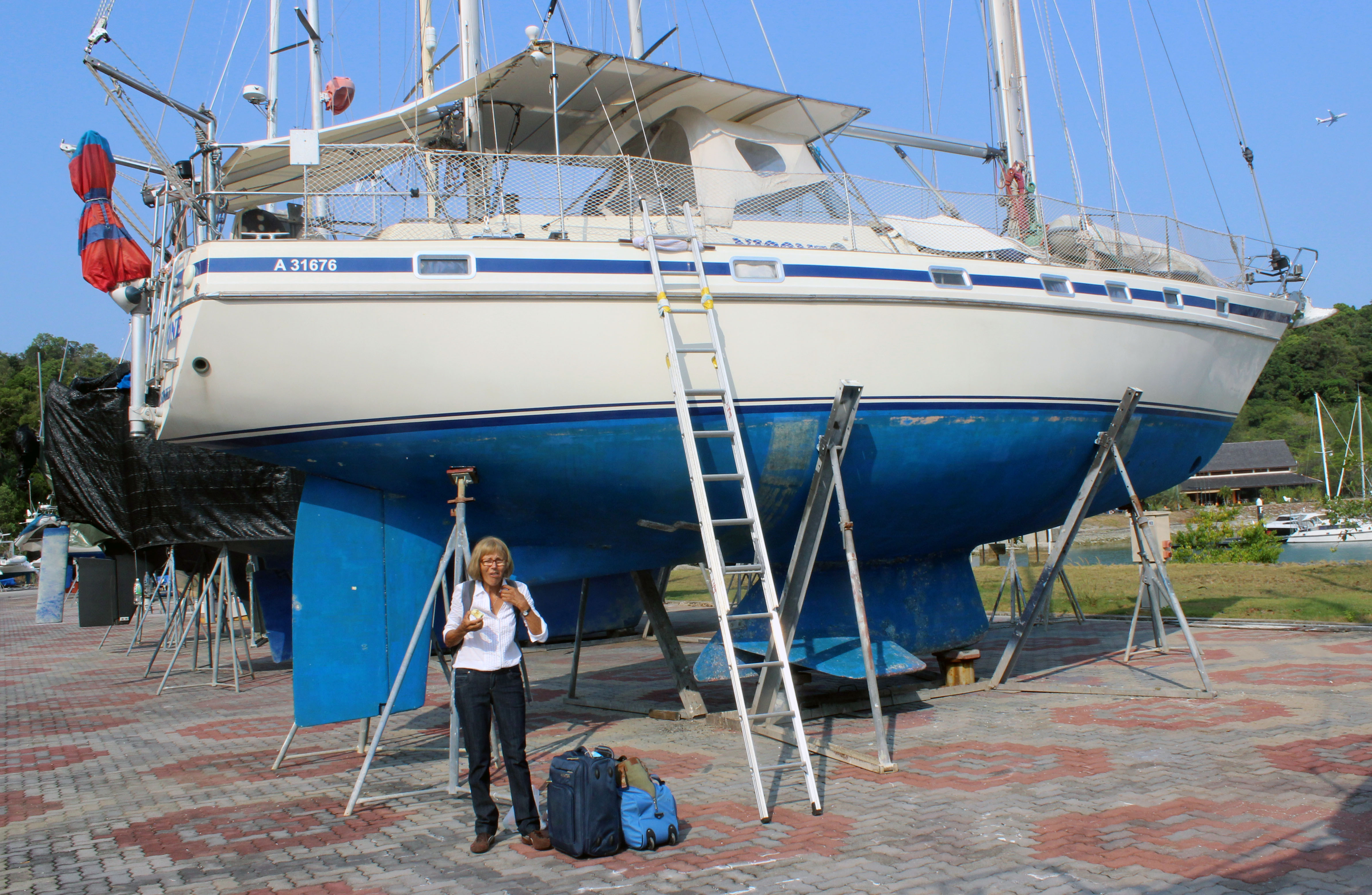 … unser „zu Hause“, das Boot NICONE wartet derweil auf der Insel Langkawi in Malaysia an der Grenze zu Thailand auf einem Marina-Trockenplatz, wo es beaufsichtigt wird und bereits gewisse Arbeiten vorgenommen werden bis zu unserer Rückkehr.